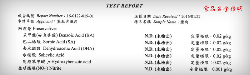 | 無防腐劑及亞硝酸鹽檢驗證明 |